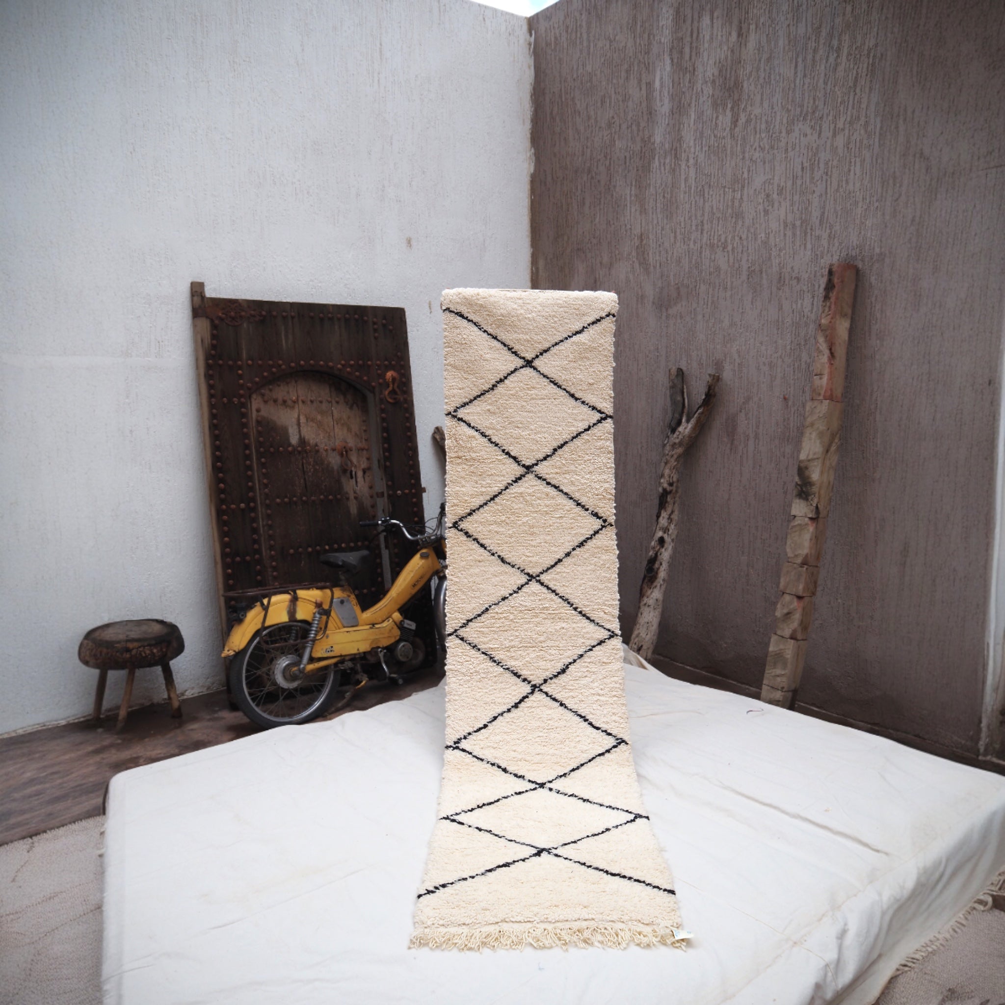 De Beni Ouaraine is een klassieker onder de Marokkaanse vloerkleden. Met de hand geweven van 100% schapenwol, en herkenbaar aan het grafische zwarte lijnenpatroon op een zachte, crèmekleurige basis. Luxueus onder je voeten, minimalistisch in uitstraling.