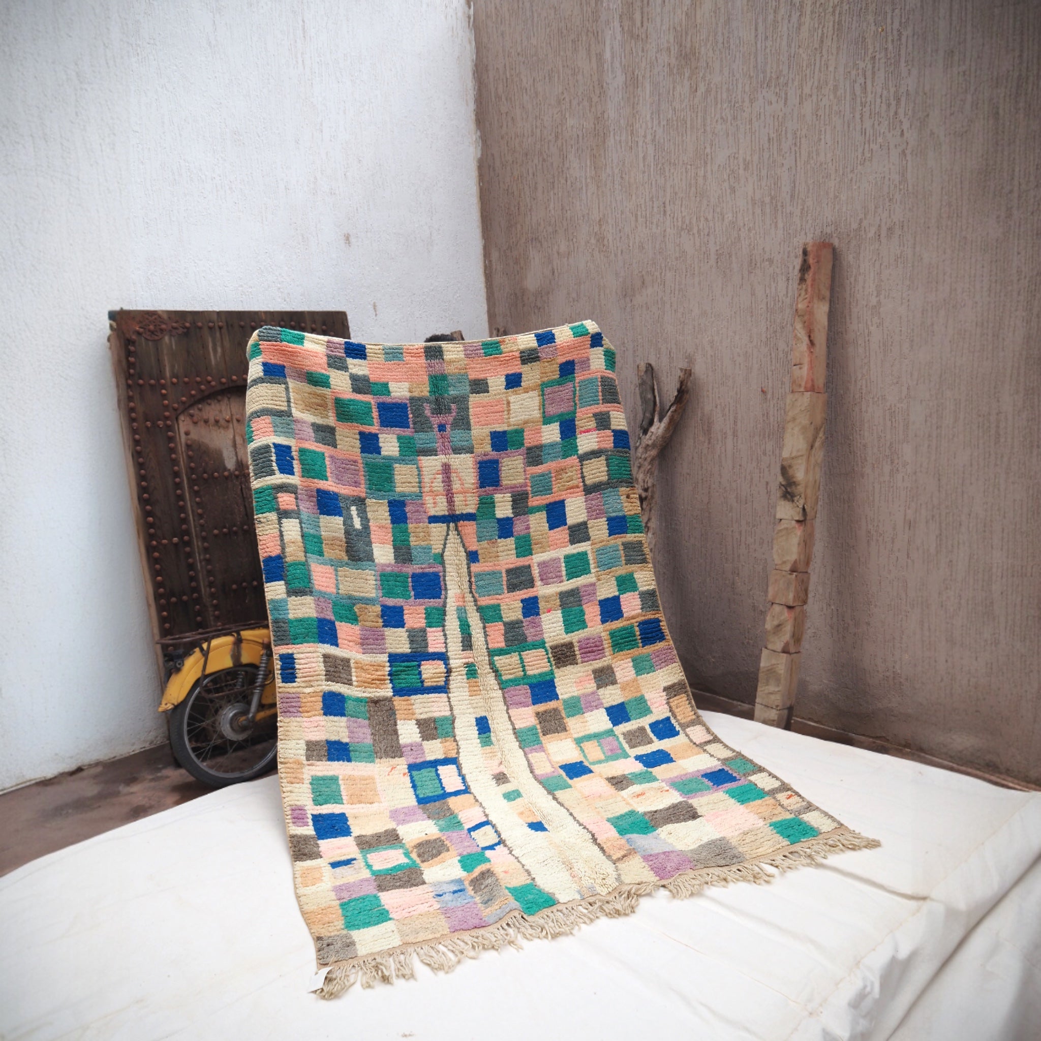 Breng zon, ziel en karakter in huis met dit authentieke boujaad vloerkleed van Bravas Boutique. Elk exemplaar is met liefde en vakmanschap geweven in Marokko, van 100% vintage wol. Geen massa, maar een kunstwerk vol kleur, textuur en verhaal.