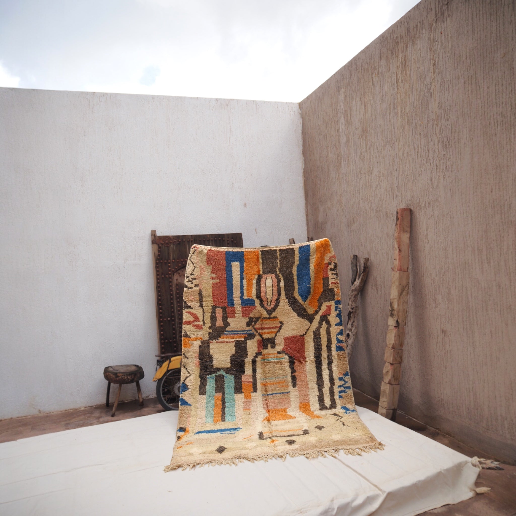 Breng zon, ziel en karakter in huis met dit authentieke boujaad vloerkleed van Bravas Boutique. Elk exemplaar is met liefde en vakmanschap geweven in Marokko, van 100% vintage wol. Geen massa, maar een kunstwerk vol kleur, textuur en verhaal.